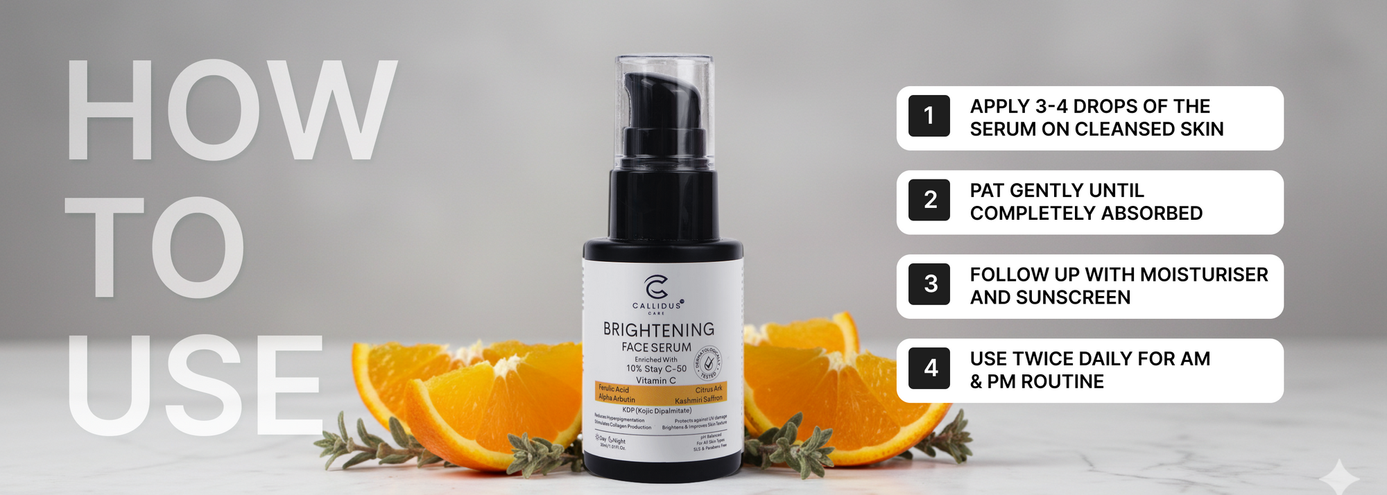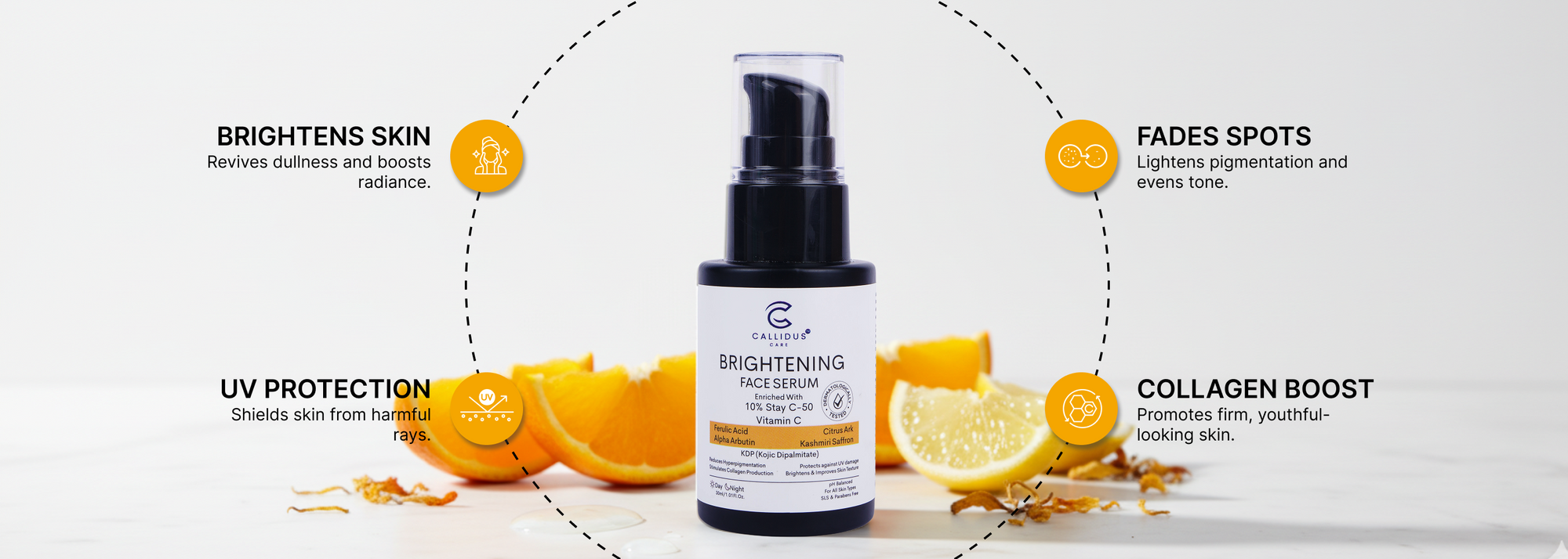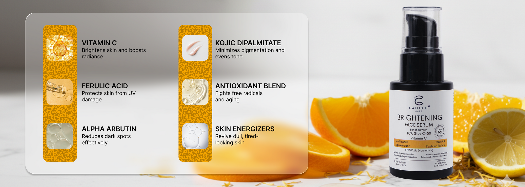 The Callidus Care Brightening Face Serum provides enhanced radiance with glow like no other serum and This serum is also among the best vitamin C serums available for skin health. With a light formula consisting of, Ferulic Acid, Alpha Arbutin, and botanicals to effectively treat dullness, pigmentation marks, and other forms of visible pigment or patchiness for an overall radiant, healthy and hydrating skin. The Callidus Care Brightening Face Serum has been dermatologically tested and is pH-balanced, making it a suitable daily serum for all skin types. Experience the benefits of buying Vitamin C Face Serums that are designed to improve the appearance of your skin.